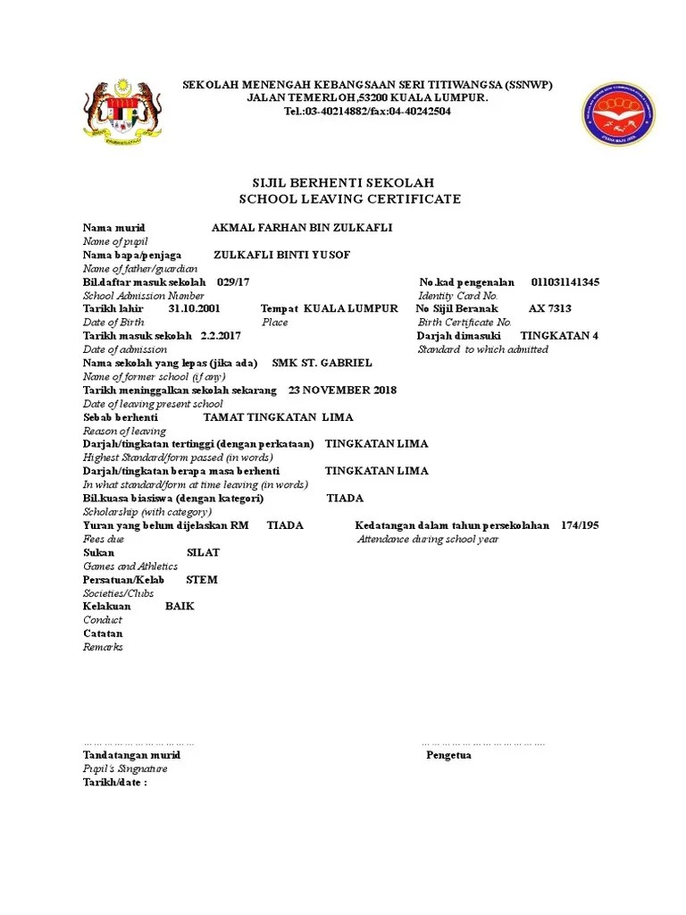 Sijil Tamat Sekolah Menengah / Contoh Sijil Berhenti Sekolah Otosection